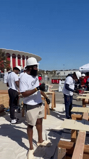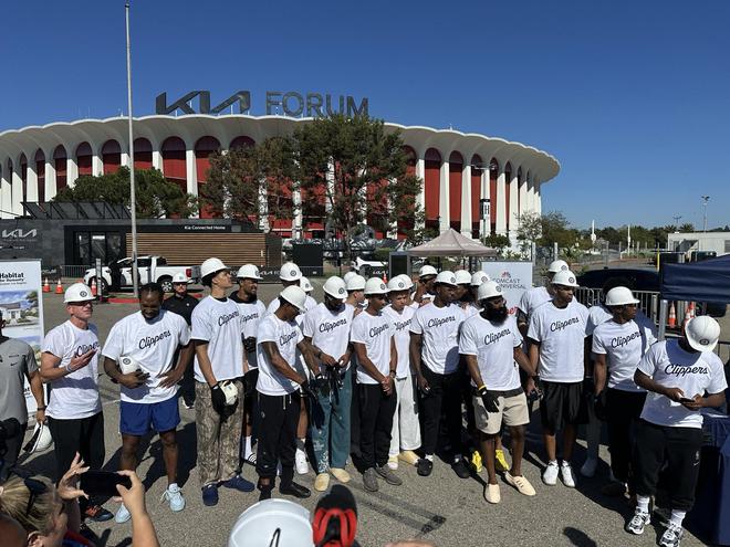 北京时间10月12日,快船全队在英格尔伍德参加社区活动,小卡、哈登、保罗等球员都戴着安全帽并且干起了木工活,期间哈登看着正经干活的小卡哈哈大笑,40岁保罗认真工作;另外快船众将与当地球迷互动,活动结束后全队合影留念。
